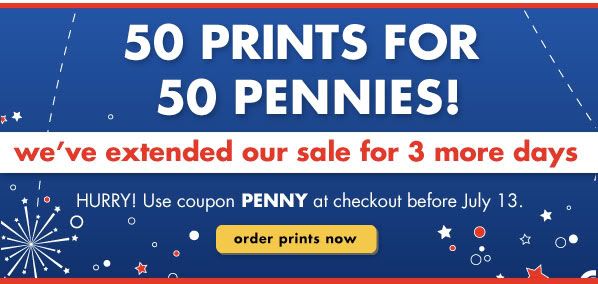 Snapfish has extended their deal for 50 prints for 50 cents! You now have until Monday, July 13th to redeem. Go HERE and enter the code PENNY at checkout!